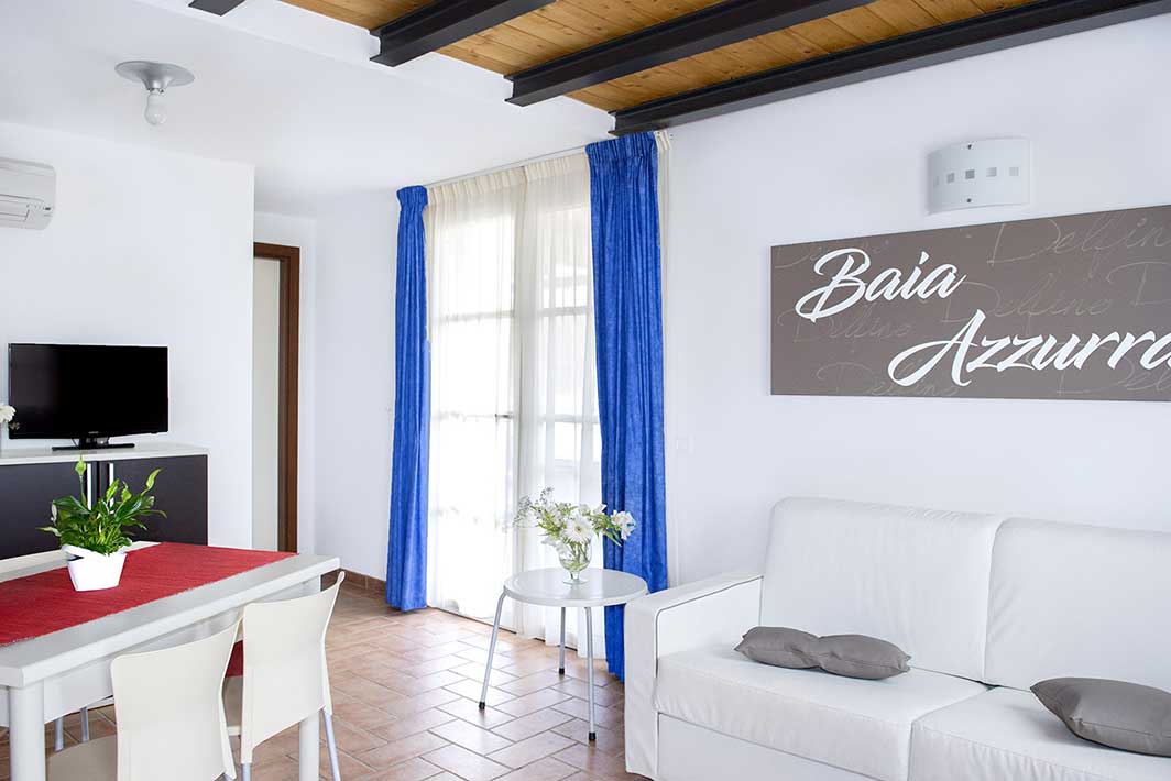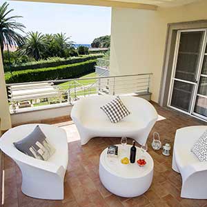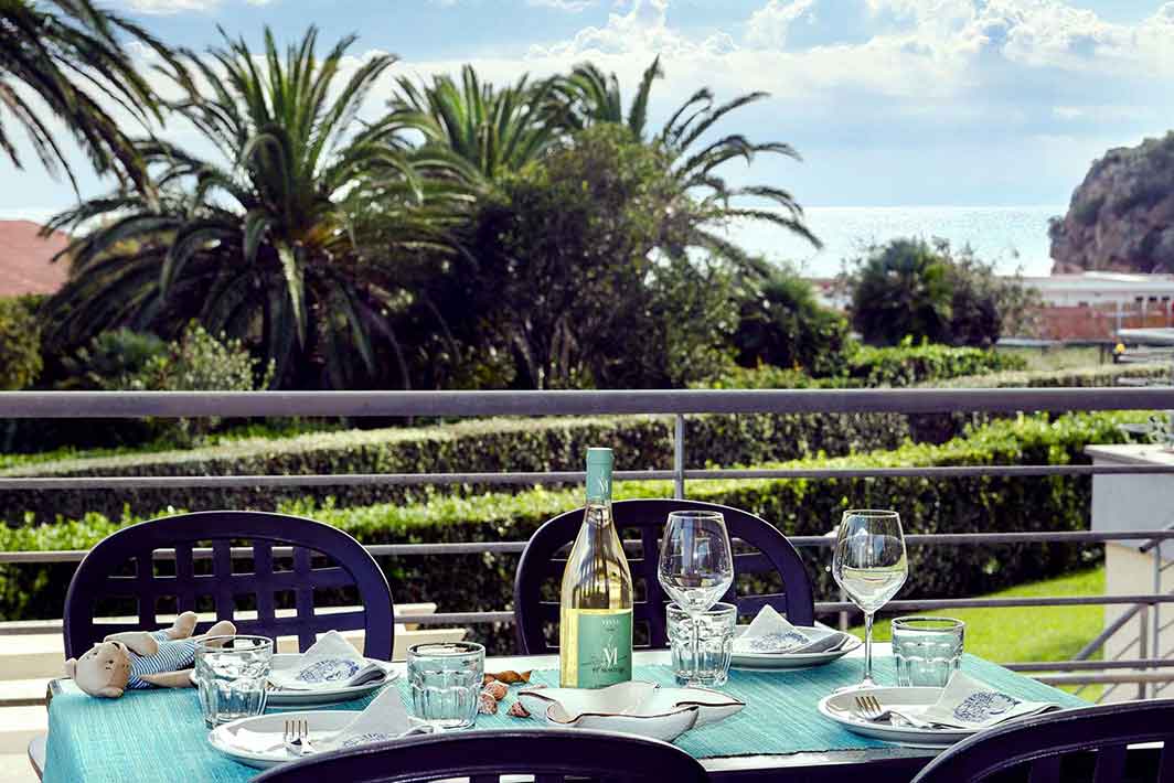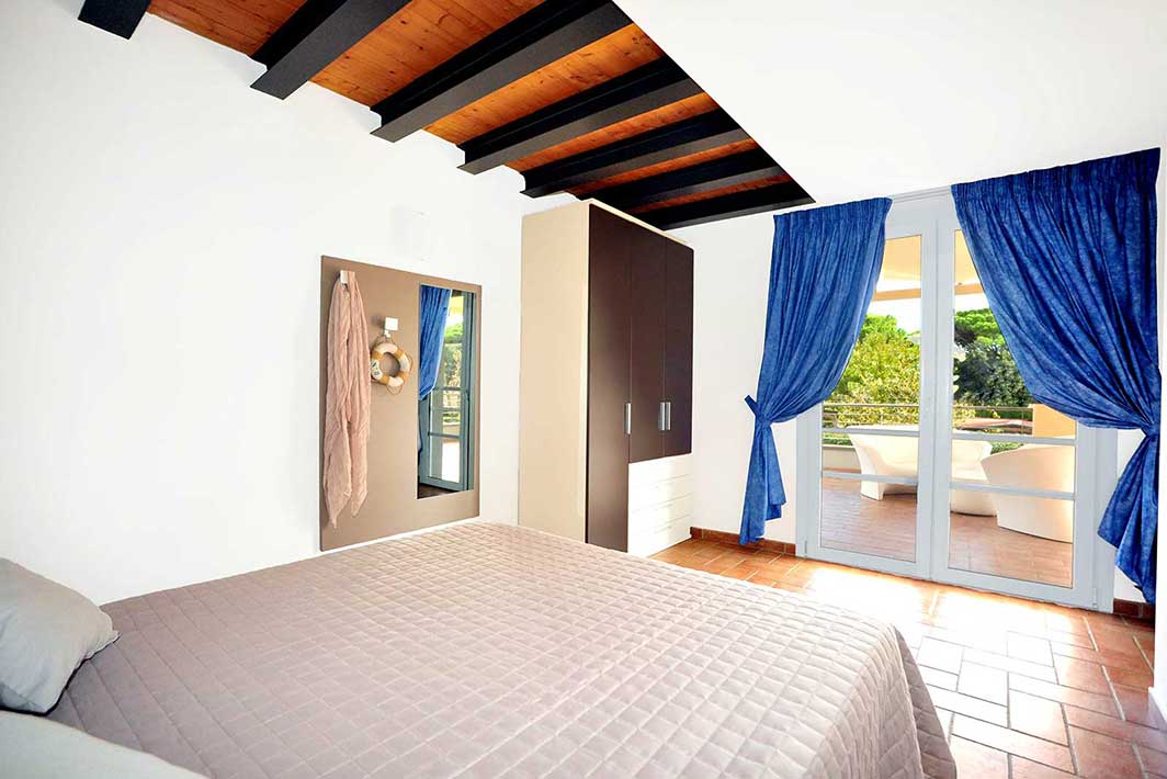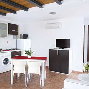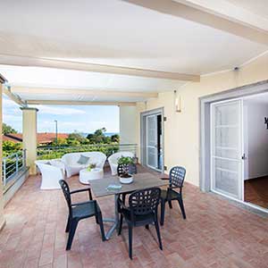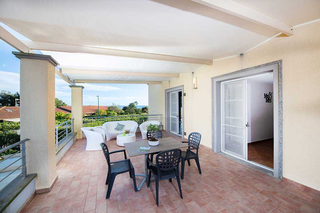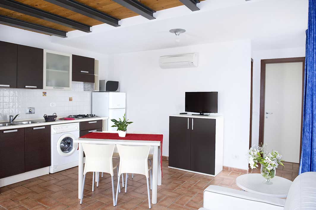 A first floor apartment of 42m2 with an independent entrance, terrace with a sea view equipped with table, seats, sunbeds and barbecue, a double bedroom (+ extra bed), bathroom with shower, bidet and a wall-fitted hair dryer, living-dining room with double sofa bed, an equipped kitchenette, dishwasher, TV, washing machine, microwave oven, warm/cold air conditioning and a safe.