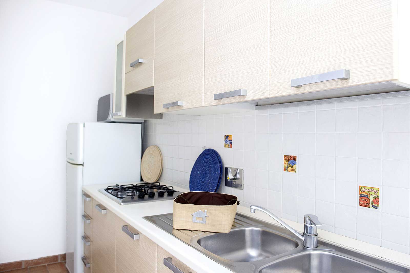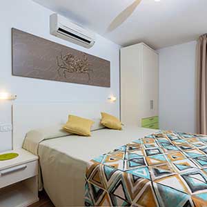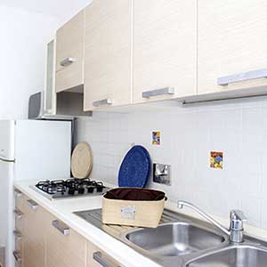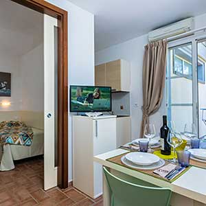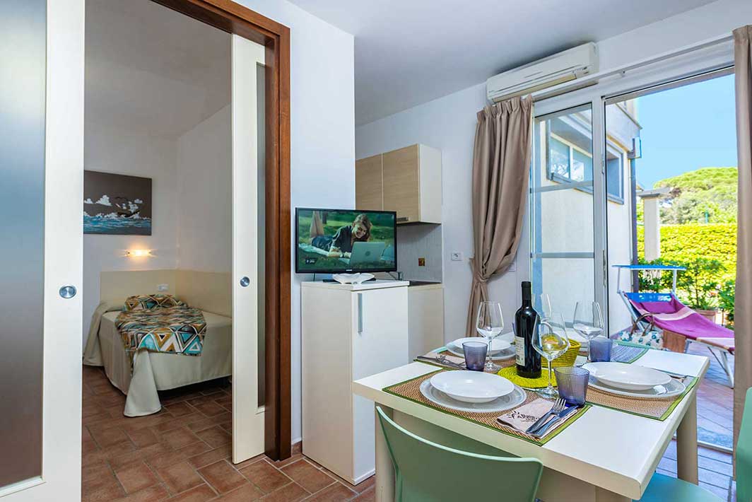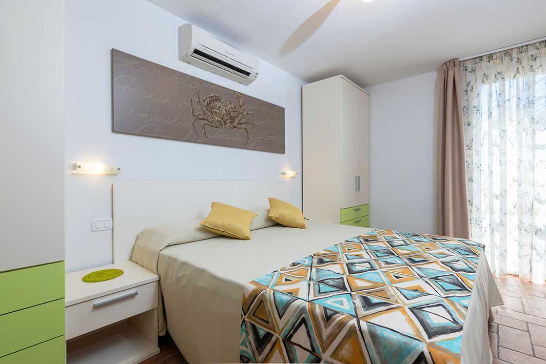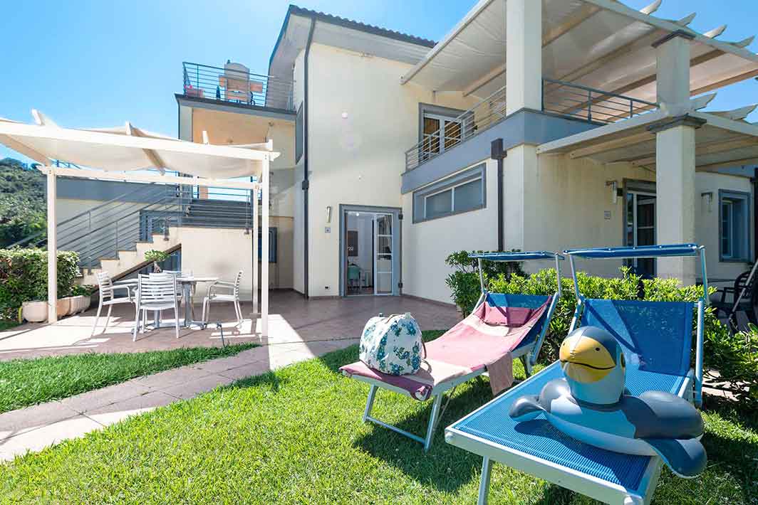 A ground floor apartment of 46m2 with an independent entrance, private garden equipped with table, seats, sunbeds and barbecue, a double bedroom, and a bedroom without windows with 2 single beds, bathroom with shower, bidet and a wall-fitted hair dryer, living-dining room with double sofa bed, an equipped kitchenette, dishwasher, TV, washing machine, microwave oven, warm/cold air conditioning and a safe.
